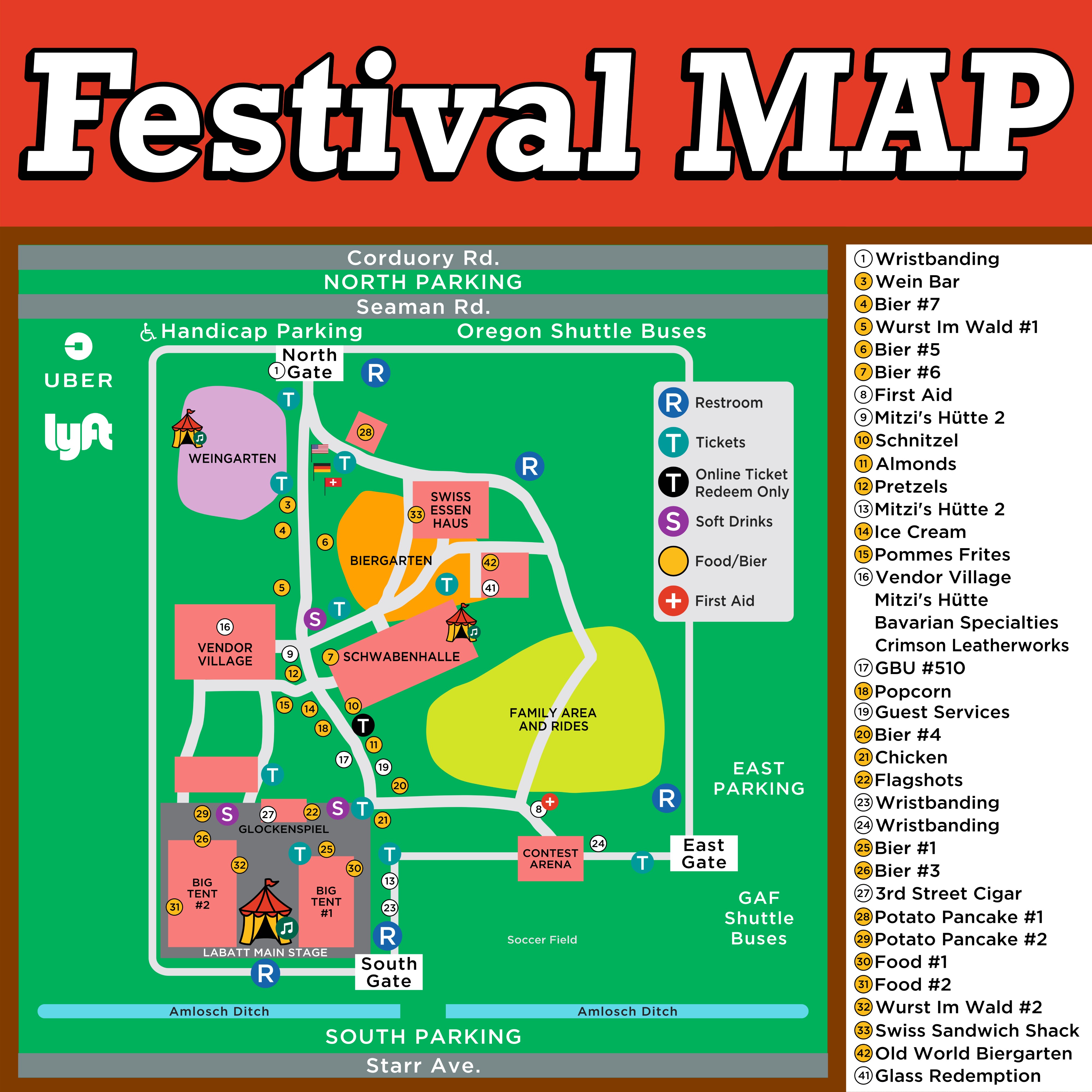 Alternative entrances to the festival from the parking areas can be accessed through the Starr Ave or Seaman St parking areas.
